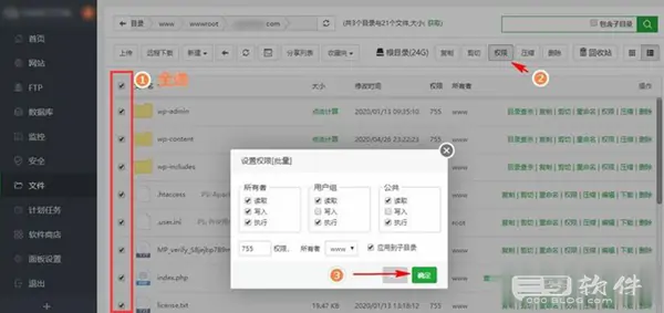如果你用不到上面的命令,只有一个虚拟机管理后台,也可以自己设置用户组属性和读写权限,比如在宝塔面板中,我们可以进入到对应网站的根目录,然后全选,点击“权限”,在弹窗中直接点击“确定”即可,修改了权限以后,再次回去更新,就应该很顺利了。
